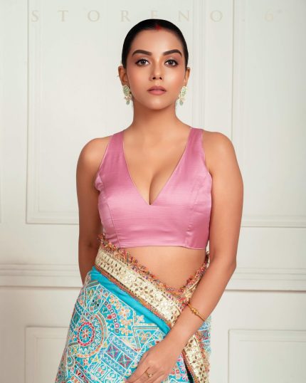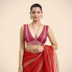 Ahana x Tyohaar | Rani Pink Sleeveless FlexiFi Saree Blouse with Plunging Neckline and Back Cut Out with Tasteful Golden Gota Lace Embellishment