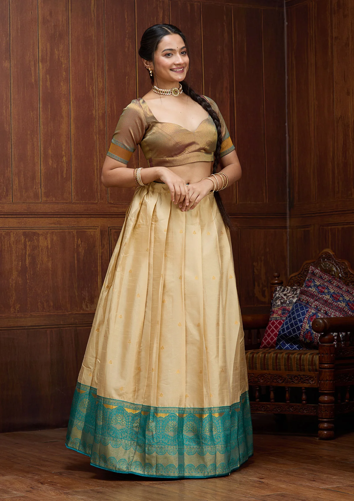 Step into a world of timeless charm with the Banarasi Cream Lehenga, where traditional meets trendy! Crafted from luxurious Banarasi fabric, this exquisite piece promises a smooth feel and glamorous sheen. Perfect for making a grand entrance at any evening event, this lehenga captivates with its plain, majestic elegance and an air of regal simplicity.