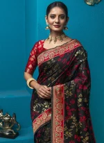 Be the sunshine of everyone’s eyes, dressed in this beautiful black color banarasi silk designer traditional saree. The ethnic jacquard woven work all over the saree with innovative traditional floral motifs designs enhanced by distinctive border and rich pallu looks chic. This saree comes with an unstitched red color jacquard woven banarasi silk blouse. This saree is perfectly suited for festive wear and for all occasions. Allu looks chic. This saree comes with an unstitched red color jacquard woven banarasi silk blouse. This saree is perfectly suited for festive wear and for all occasions.