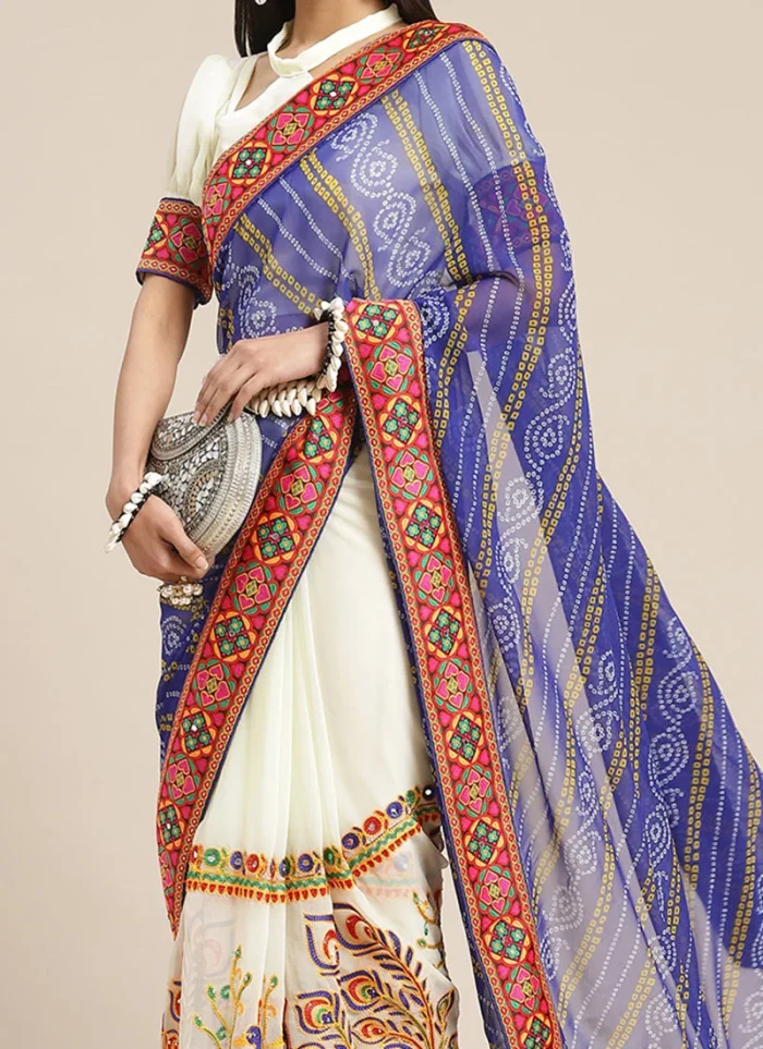 This exquisite party wear saree embodies elegance and charm with its meticulous craftsmanship and captivating design. Crafted from delicate pink Georgette fabric this saree exudes a graceful aura. Georgette known for its lightweight and flowing nature ensures comfort and effortless draping perfect for long hours of celebration. The saree features intricate embroidery in the Kutchi style showcasing the rich cultural heritage of Gujarat India. Adorned with vibrant peacock patterns meticulously embroidered on a white base the saree captures attention with its intricate detailing and vibrant hues. The peacock motifs symbolize grace beauty and prosperity adding a touch of tradition and symbolism to the ensemble. Adding to its allure is the pallu beautifully adorned with a bandhini pattern in pink adding depth and texture to the design. Bandhini a traditional tiedye technique creates mesmerizing patterns enhancing the overall aesthetics of the saree. The pink pallu complements the base color creating a harmonious and visually pleasing contrast. This saree is perfect for special occasions and celebrations exuding sophistication and style. Whether its a wedding party or festive gathering this saree is sure to make you stand out with its unique blend of traditional craftsmanship and contemporary elegance.