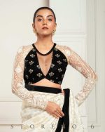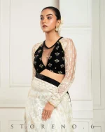 - Half And Half Full Sleeve Blouse With Zari nd Sequins Embroidered Black Velvet and Off-White Thread and Sequins Embroidered Net.