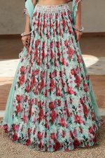 Featuring a green lehenga in viscose organza base with floral print. It is paired with a blouse having pearl work and a soft net dupatta. Accentuate it with statement earrings and heels for mehendi or engagement ceremonies.