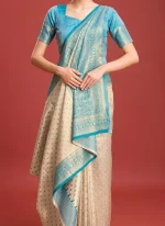 • The Kanchipuram Silk Zari Woven Dual Color Traditional Beige Saree with Contrast Sky Blue Blouse is a masterpiece of Indian textile artistry representing the epitome of elegance and cultural heritage. This saree hailing from the renowned weaving town of Kanchipuram is crafted from pure silk making it both luxurious and durable. The beige base of the saree is intricately woven with zari a type of fine gold or silver thread creating intricate patterns that exude a regal charm. The dualcolor aspect of the saree adds depth and dimension with the beige merging seamlessly into a striking sky blue pallu and border offering a captivating contrast that draws the eye.