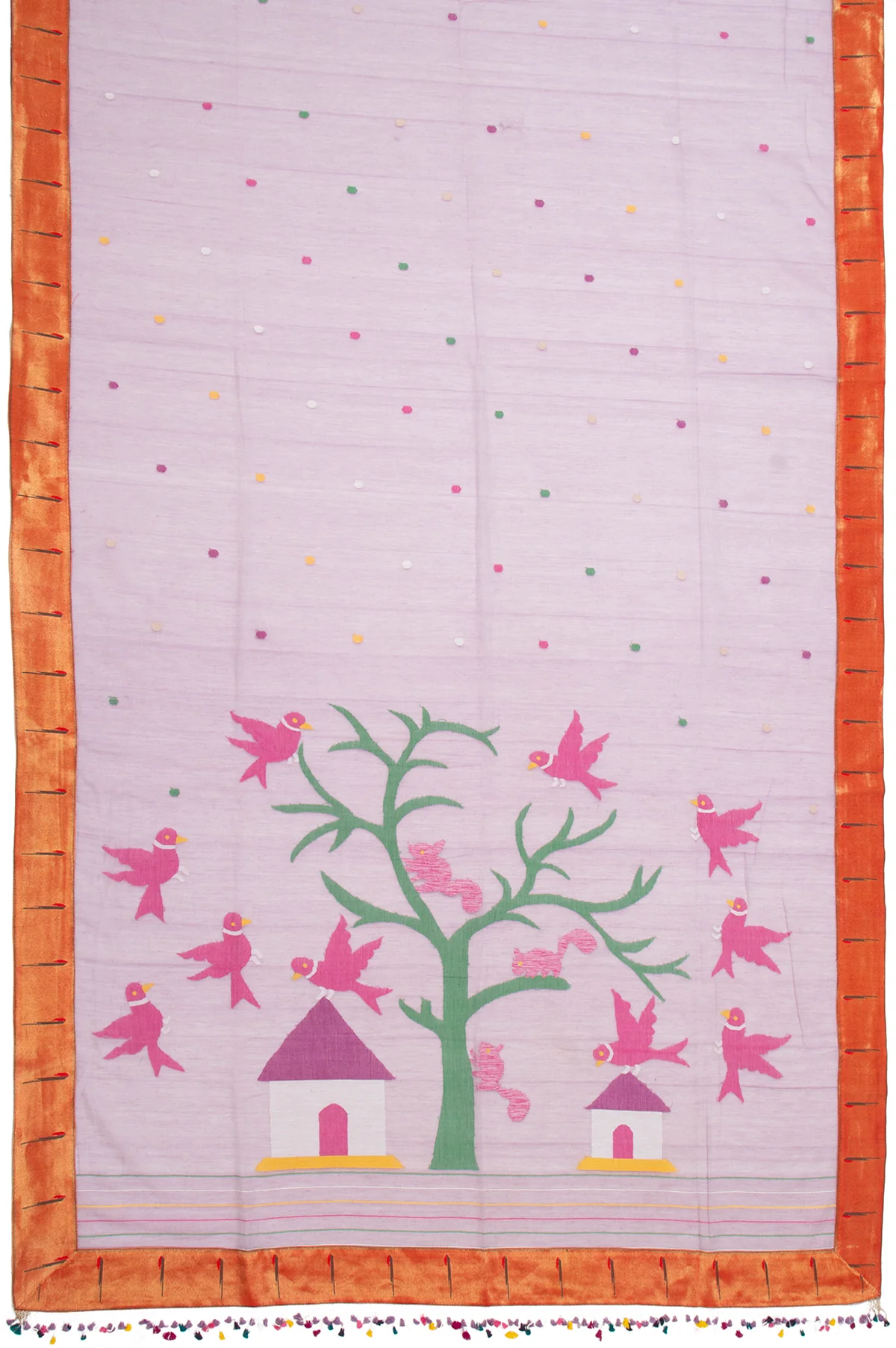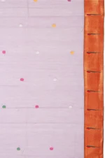 Make a bold statement with our Lavender Bengal Jamdani Saree. The sky blue plain border adds a pop of color. The self-colored pallu features Jamdani work, tree motifs, stripes, and tassels. The blouse comes with stripes and a border, and the body design is adorned with Jamdani work butta for a distinctive look.