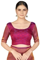 • The Magenta Kanchipuram Silk Zari Woven Saree is a timeless masterpiece that radiates elegance and tradition. Crafted from luxurious Kanchipuram silk this saree epitomizes the heritage and artistry of South Indian weaving. The vibrant magenta hue lends a regal and festive charm making it a standout choice for grand celebrations and auspicious occasions. The intricate zari work woven throughout the saree showcases exquisite craftsmanship featuring traditional motifs that enhance its opulent appeal. Complementing the saree is a matching magenta silk blouse adorned with zari weaving which can be customized to fit your style preferences and add a touch of individuality.