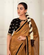 - Black Velvet Embroidered Blouse Embellished With Golden Zari And Sequins Work,Adding Black And Golden Border And Beads.