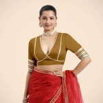 Nafeeza x Tyohaar | Bronze Gold Embellished Elbow Sleeves FlexiFi Saree Blouse with Plunging V Neckline with Tasteful Golden Gota Lace