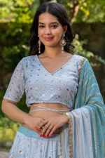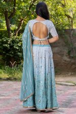 Featuring an ocean blue kalidar lehenga in georgette base with embellishments. It is paired with a blouse having a v-neckline and lace detailing, including a dupatta. Accentuate with chandbali earrings and heels for a wedding or sangeet ceremony.