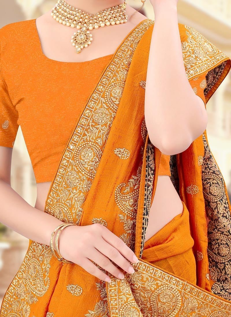 We unfurl our creations highlighted in this orange Vichitra silk saree. The ethnic golden thread embroidered n stones works over the saree with traditional designs adds a sign of statement for your look. This saree comes with an unstitched, two-tone vichitra silk blouse. This saree perfectly suits for party wear.lk blouse.