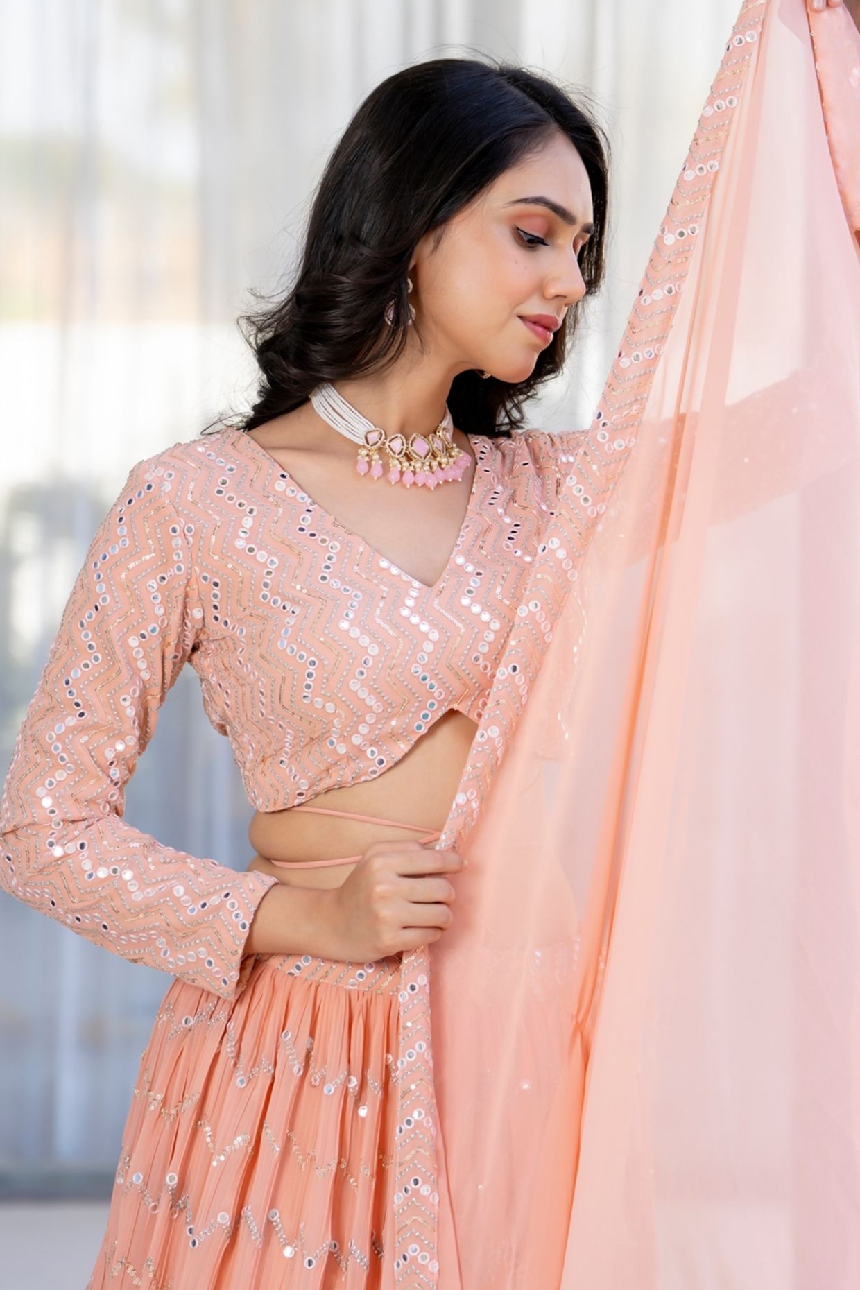 Featuring a peach lehenga in georgette base with latkans and mirror work. It is paired with a blouse and a dupatta. Accentuate it with dangler earrings and heels for festive occasions or wedding ceremonies.
