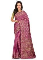 This brilliant array will make you the ultimate classic beauty at the next event you attend. You are sure to make a strong fashion statement with this pink silk designer kancheepuram traditional saree. This ravishing attire is amazingly embroidered with weaving work. Comes with matching Beige blouse.