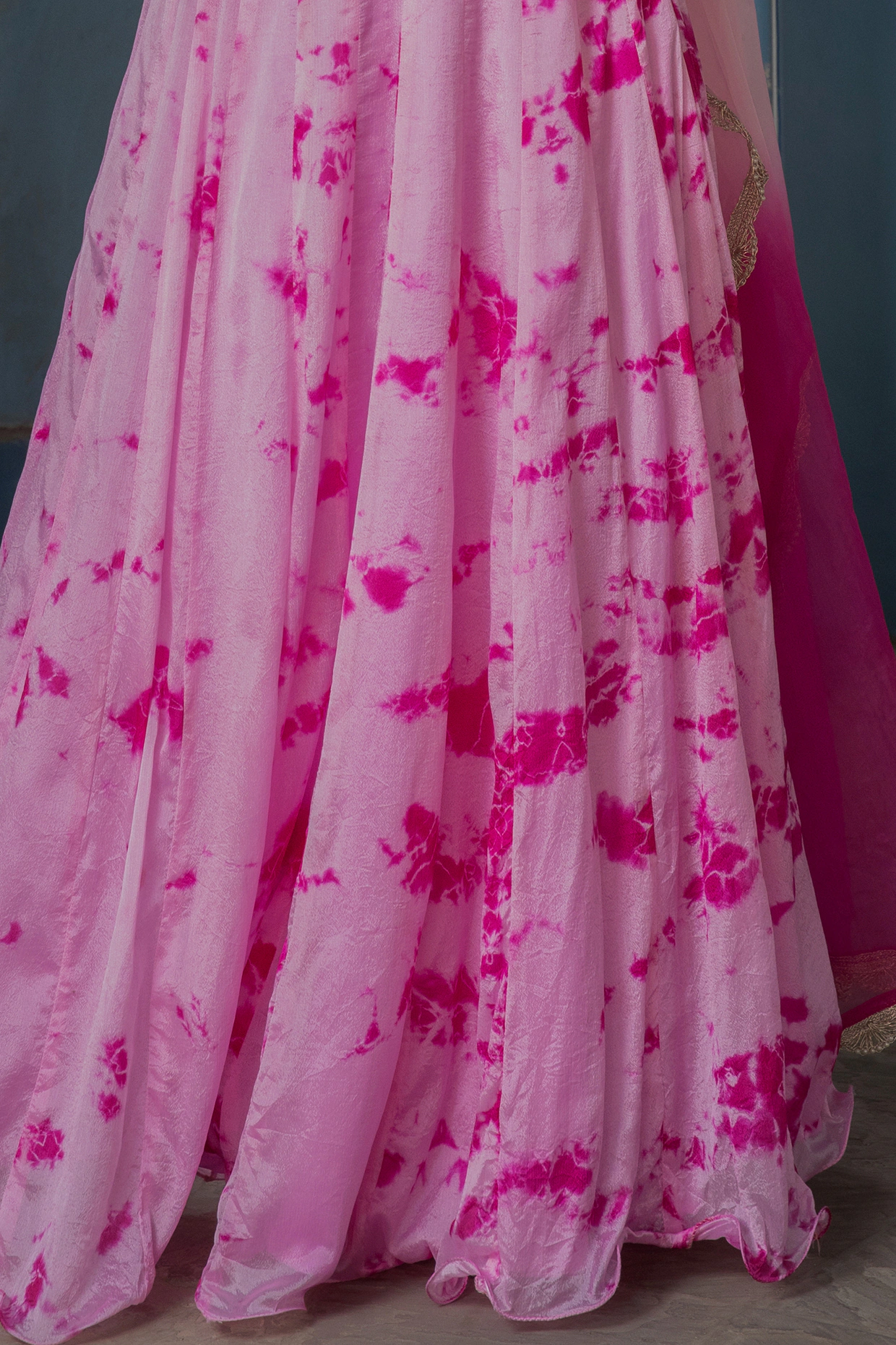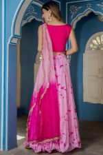 Featuring a pink blouse in viscose chinnon and a blended fabric base with an attached dupatta. It is paired with a matching lehenga having hand-tied dye, lace, and gota embroidery.