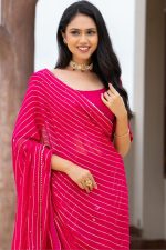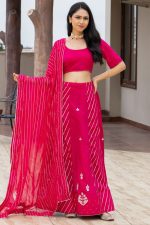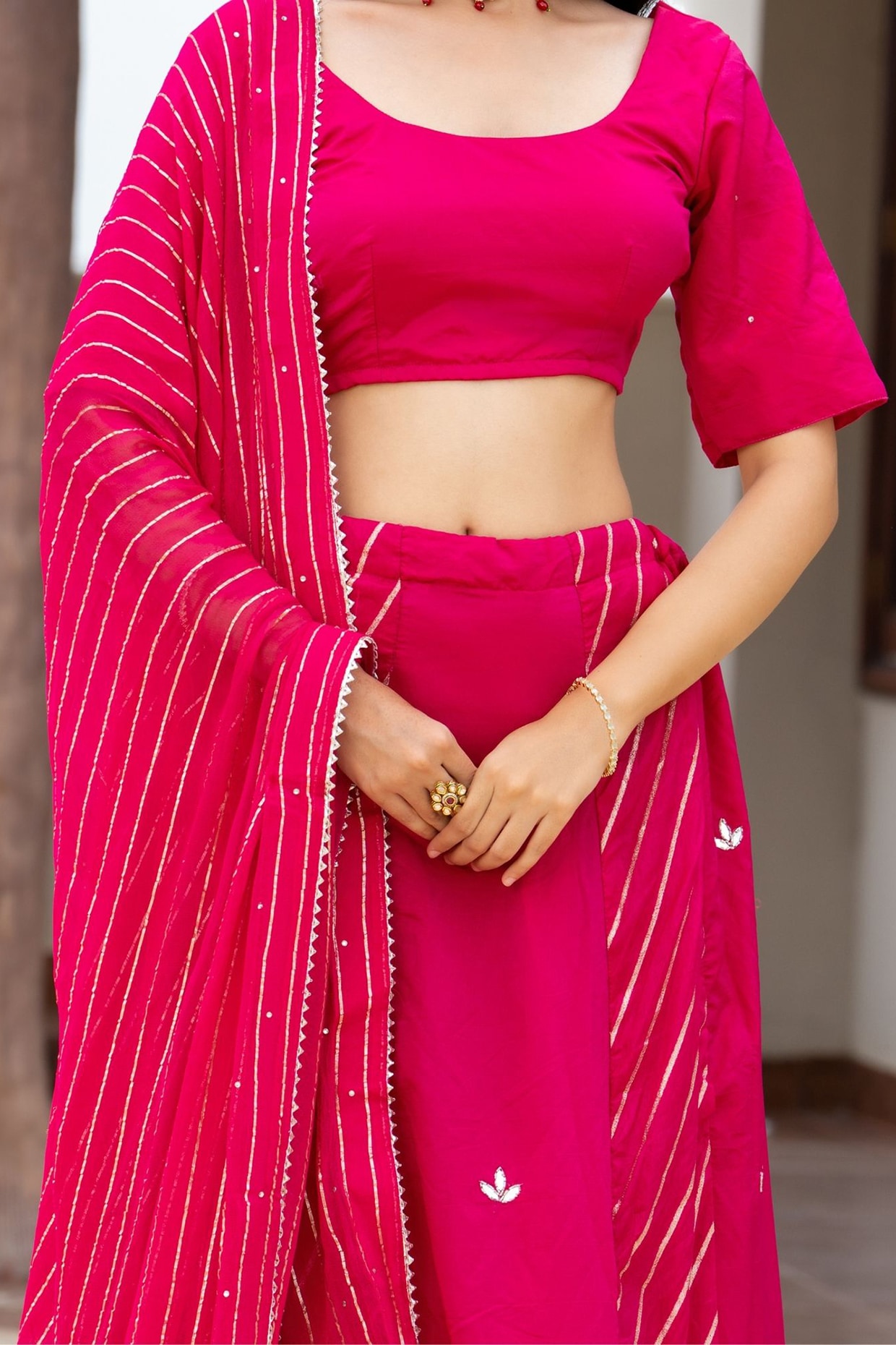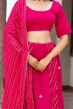 Featuring a Pink lehenga in silk blend base. It is paired with a blouse and a dupatta. Accentuate it with diamond jewellery and block heels for sangeet, engagement ceremonies or weddings