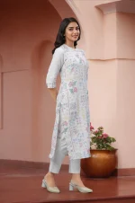Co-ord set for women in airy white seer sucker fabric, this variation offers the same blend of elegance and comfort with a distinct finish. The kurta, designed with a modern silhouette, is paired with matching pants for a clean and minimal look. Ideal for casual outings, festive brunches, or small family gatherings, it is versatile and lightweight. The breathable texture of seer sucker ensures all-day comfort, especially in warm weather. Its timeless white shade allows for endless accessorizing, whether with bold jewelry or subtle accents. This co-ord set is a wardrobe staple that balances simplicity with elegance, making it perfect for women who love modern ethnic dressing.
