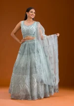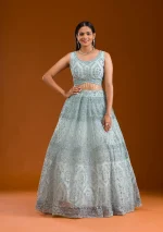 Unleash your vibrant side with mint green lehenga, a masterpiece in net fabric adorned with meticulous stonework. This lehenga blends the freshness of mint with the sparkle of delicately placed stones, creating a spectacle of light and fabric. It’s not just attire, it’s a statement—where traditional craftsmanship meets contemporary charm in an ensemble that’s as alive and effervescent as you are!.