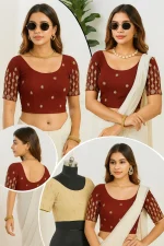 Add instant elegance to your ethnic wardrobe with this exclusive stretchable designer blouse, crafted in rich jacquard fabric with a beautiful all-over mill print. Designed for comfort and style, this blouse features a flattering scoop neckline, half sleeves, and a stretchable fit that hugs your curves perfectly.