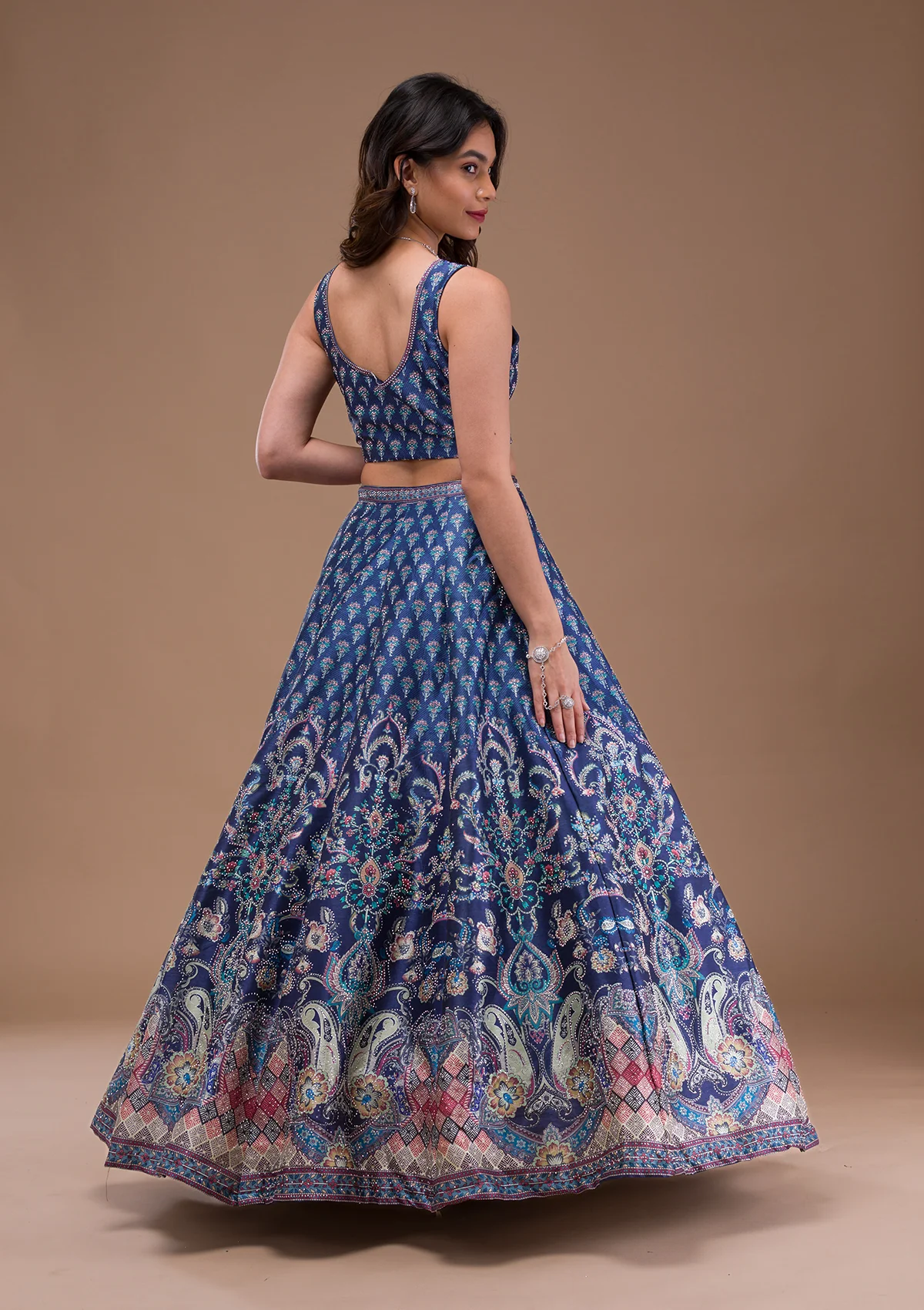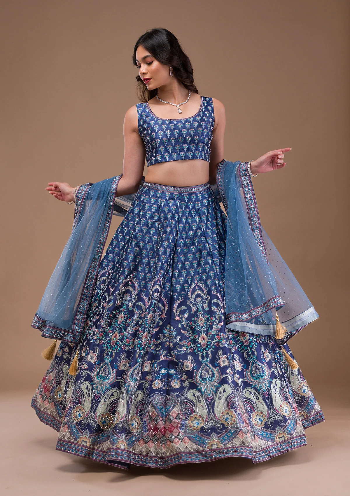 Dive into the vibrant world of Indian elegance with Blue Banarasi Lehenga, radiating a flashy charisma with intricately woven stonework that catches every beam of light. This lehenga is crafted from luxurious Banarasi fabric, offering a regal shine and an enriched feel that promises to sway gracefully at any grand event. Let your spirit dance in the lush weaves and lush patterns, where traditional craft meets playful, contemporary charm!