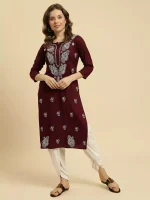 Home Kurtis Long Kurtis Wine Chikankari Kurti