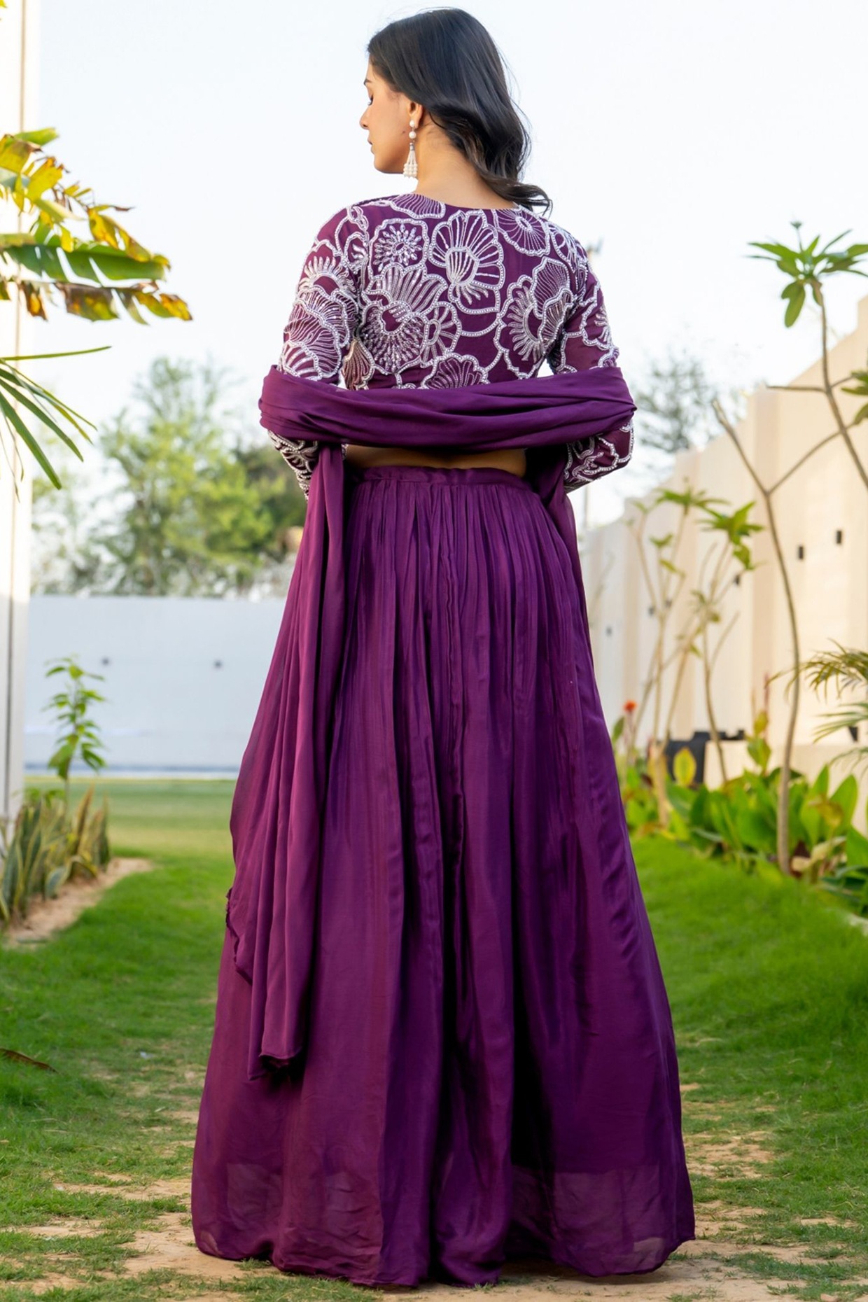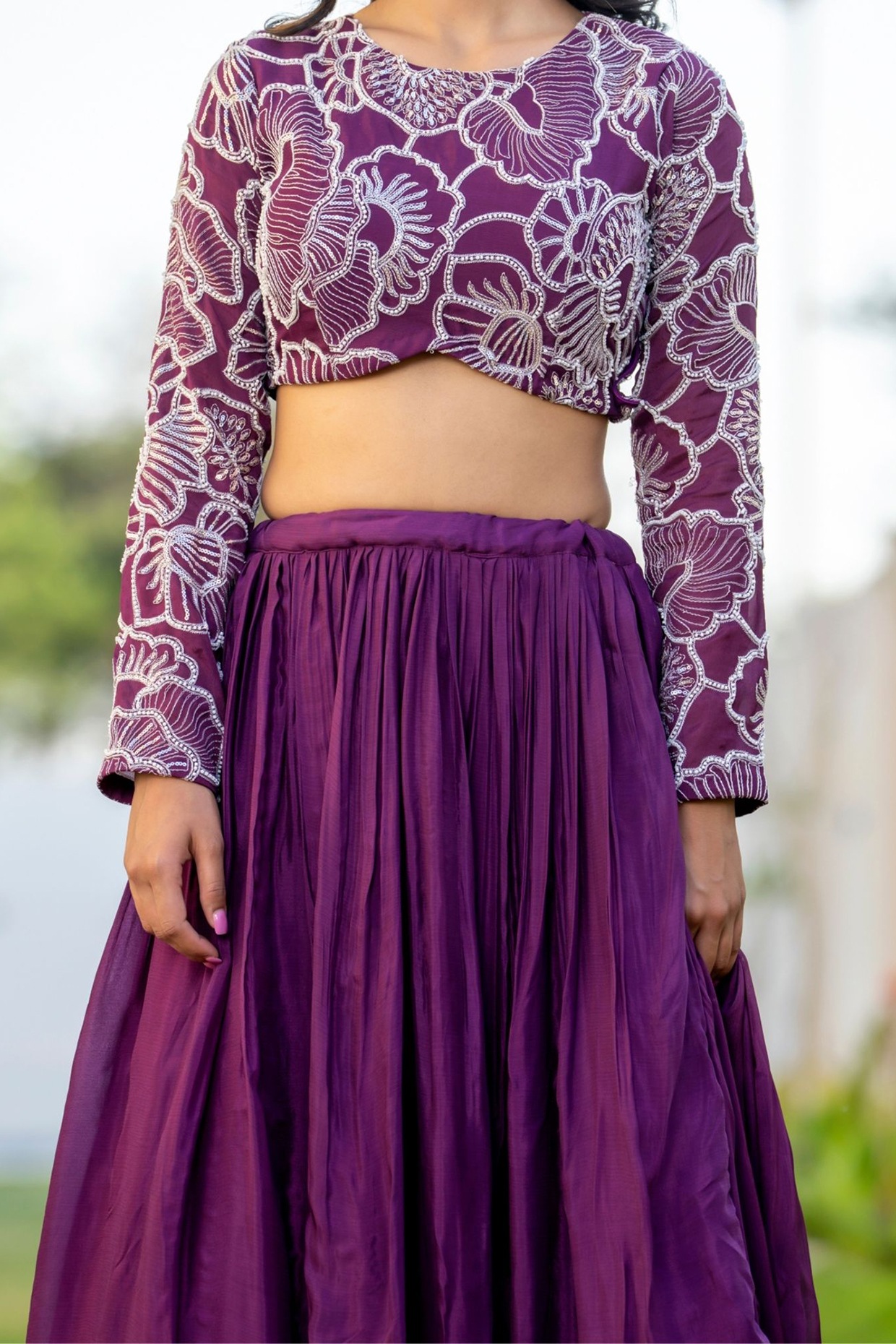 Featuring a wine lehenga in chinon and organza base. It is paired with a crop top having floral embroidery and a dupatta. Accentuate it with dangler earrings and heels for festive occasions or wedding ceremonies.