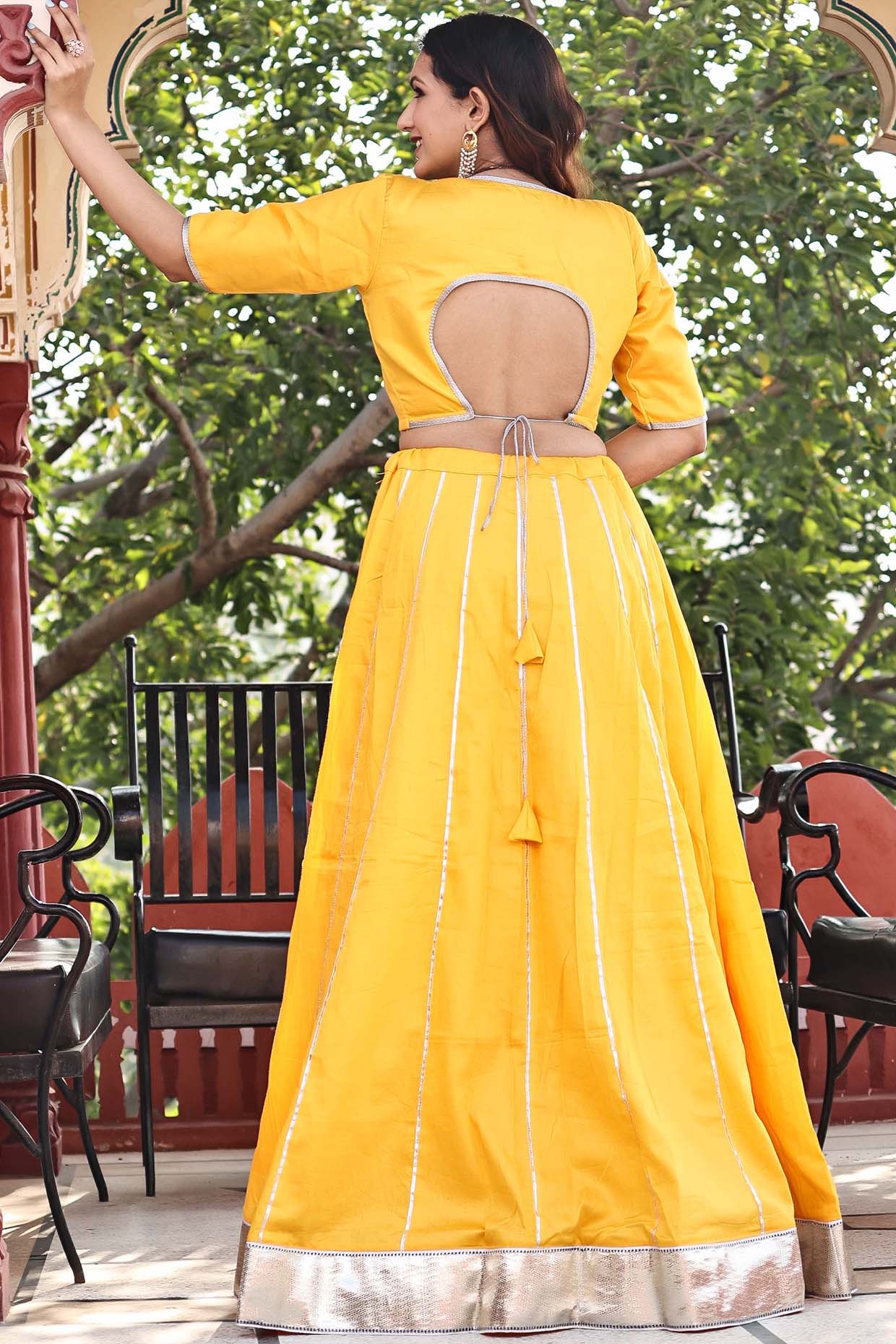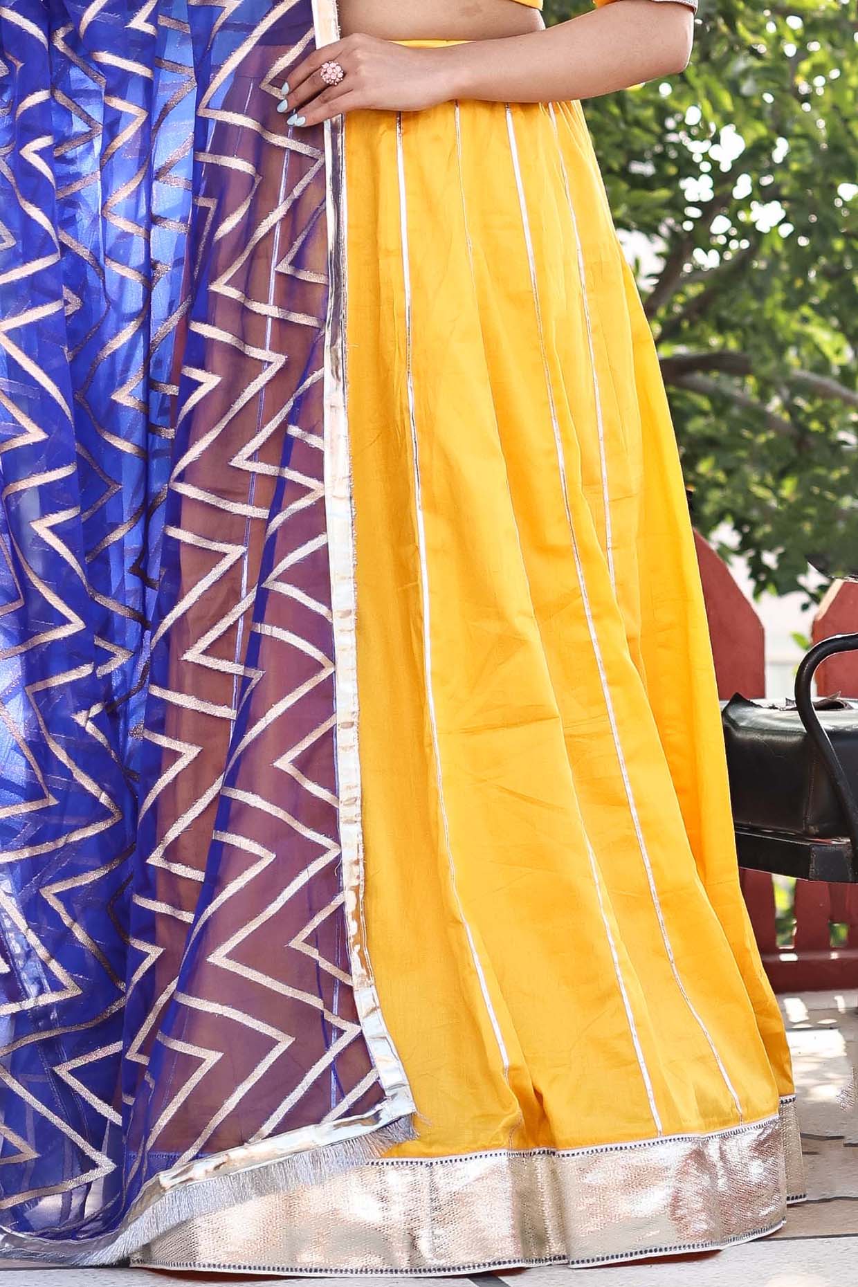 Bannhi features a Yellow Kalidar Flared Lehenga Set that captivates with its elegance. The eye-catching lehenga is crafted in cotton silk with zari and gota details. It is paired with a blouse and an organza-woven dupatta. Accessorise the designer lehenga set with statement earrings and heels for an engagement ceremony or haldi ceremony.